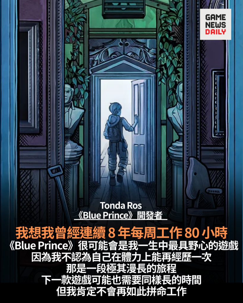 【GameNewsDaily】《Blue Prince》創作者 Tonda Ros 表示,經歷連續 8 年每周工作約 80 小時的高強度開發後,未來作品的規模與野心或將有所收斂,坦言身體難以再次承受同…