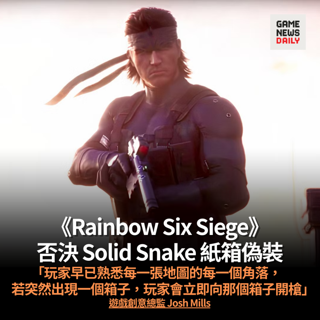 【GameNewsDaily】《Rainbow Six Siege》將於下月迎來《Metal Gear Solid》角色Solid Snake作為全新幹員登場,惟原本構思中的經典紙箱潛伏道具最終未有加…