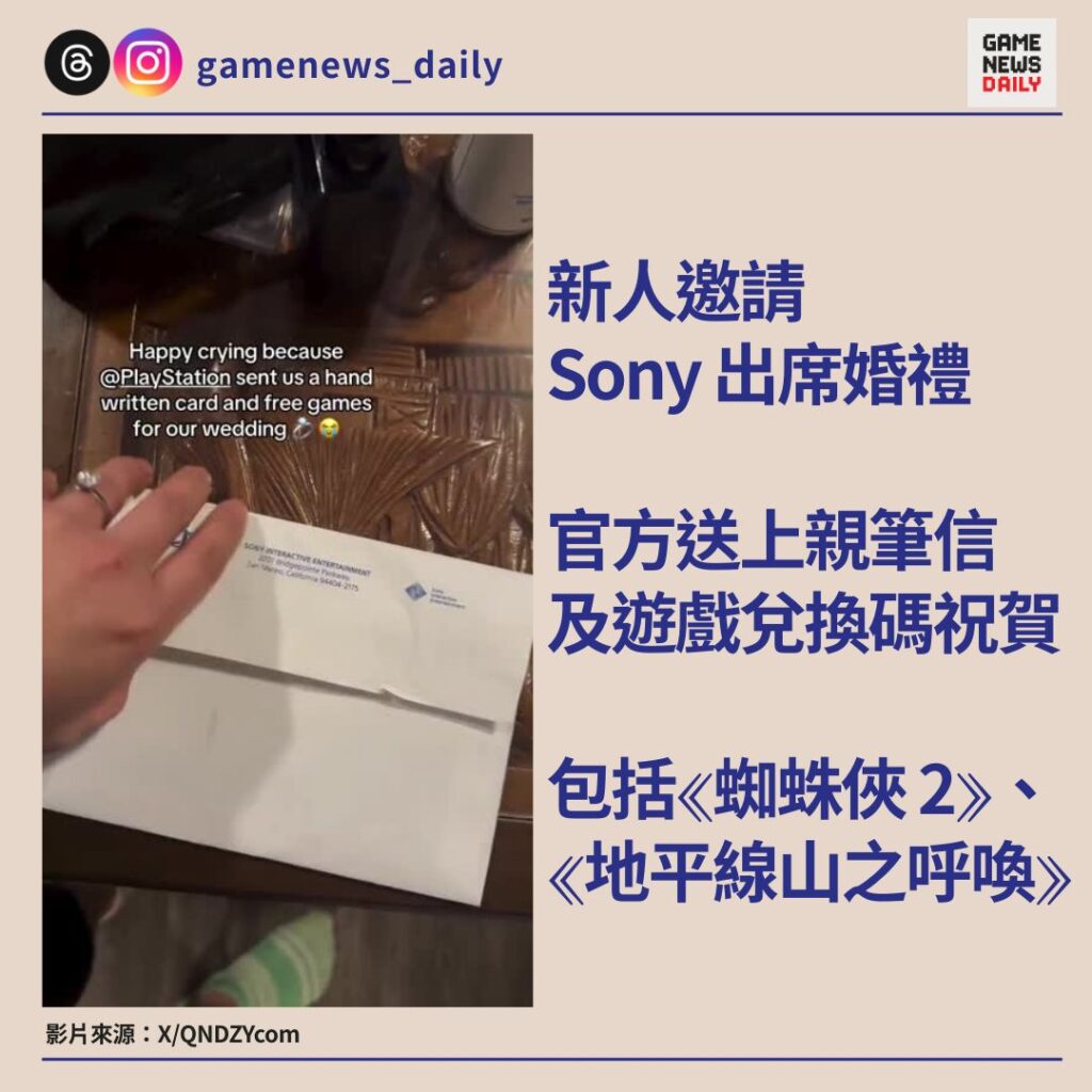 新人邀請 Sony 出席婚禮 官方送上親筆信及遊戲兌換碼祝賀