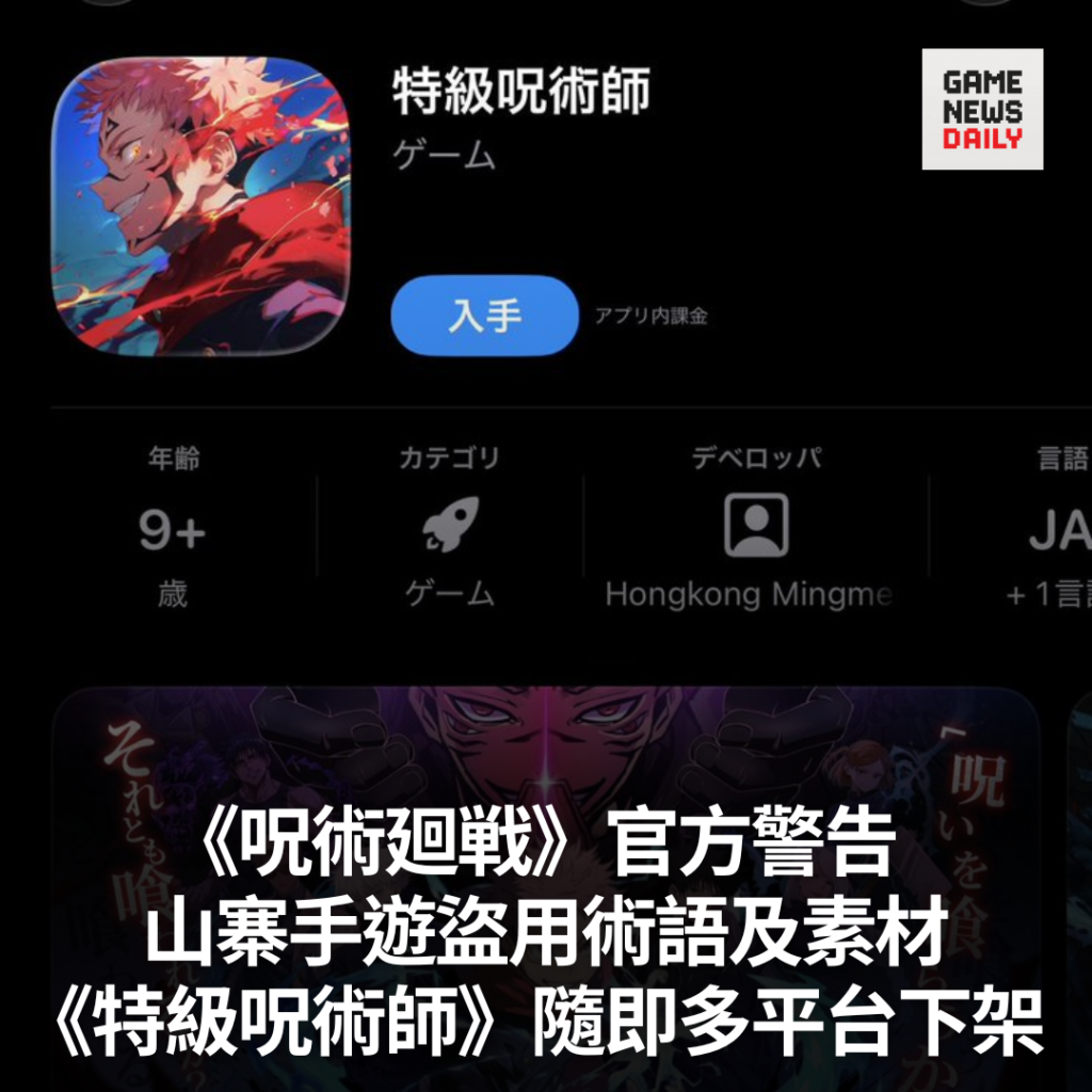 《呪術廻戦》官方警告 山寨手遊盜用術語及素材 《特級呪術師》隨即多平台下架