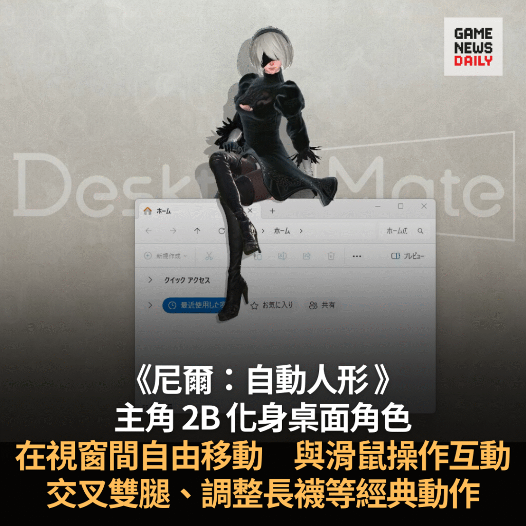 【GameNewsDaily】《尼爾:自動人形》的主角 2B 將於 10 月 9 日登上 Steam 應用程式《Desktop Mate》,以付費 DLC 形式登場。開發商 infiniteloop 宣布,這次合作讓使用者可在桌面上與 2B 互動,並收錄日語及英語語音選項。