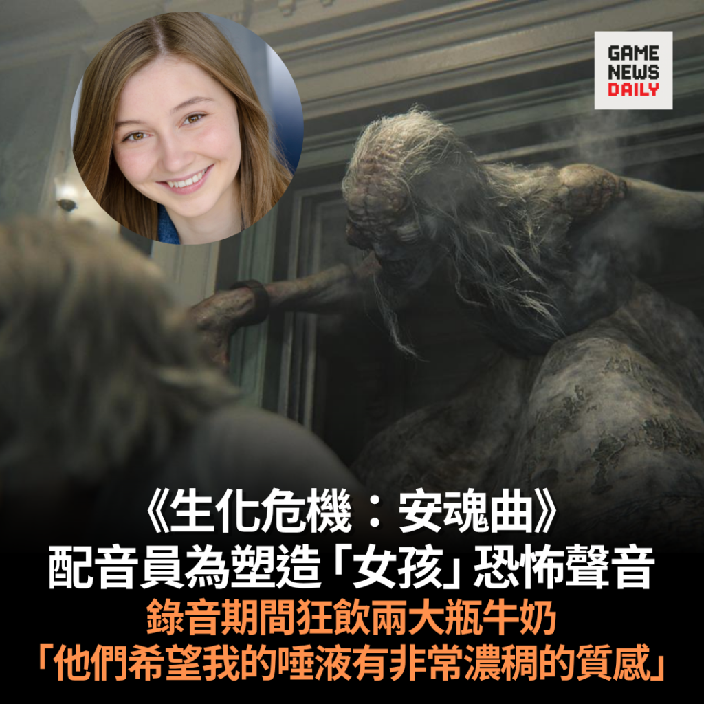 【GameNewsDaily】《生化危機:安魂曲》「女孩」因其詭異外形與令人不安的聲音引起關注,其配音員 Delanie Nicole Gill 近日透露,為呈現角色獨特聲線,她曾在錄音期間飲用大量牛奶,以達至理想效果。