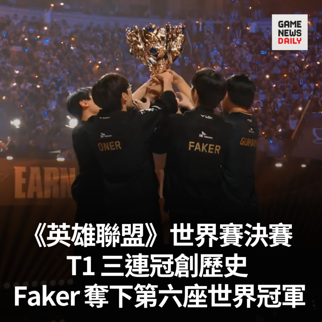 【GameNewsDaily】《英雄聯盟》世界冠軍賽總決賽在中國成都落幕,T1 以 3 : 2 擊敗 KT Rolster,達成隊史及賽事「三連冠」。中路選手 Faker 奪下個人第六座世界冠軍。
