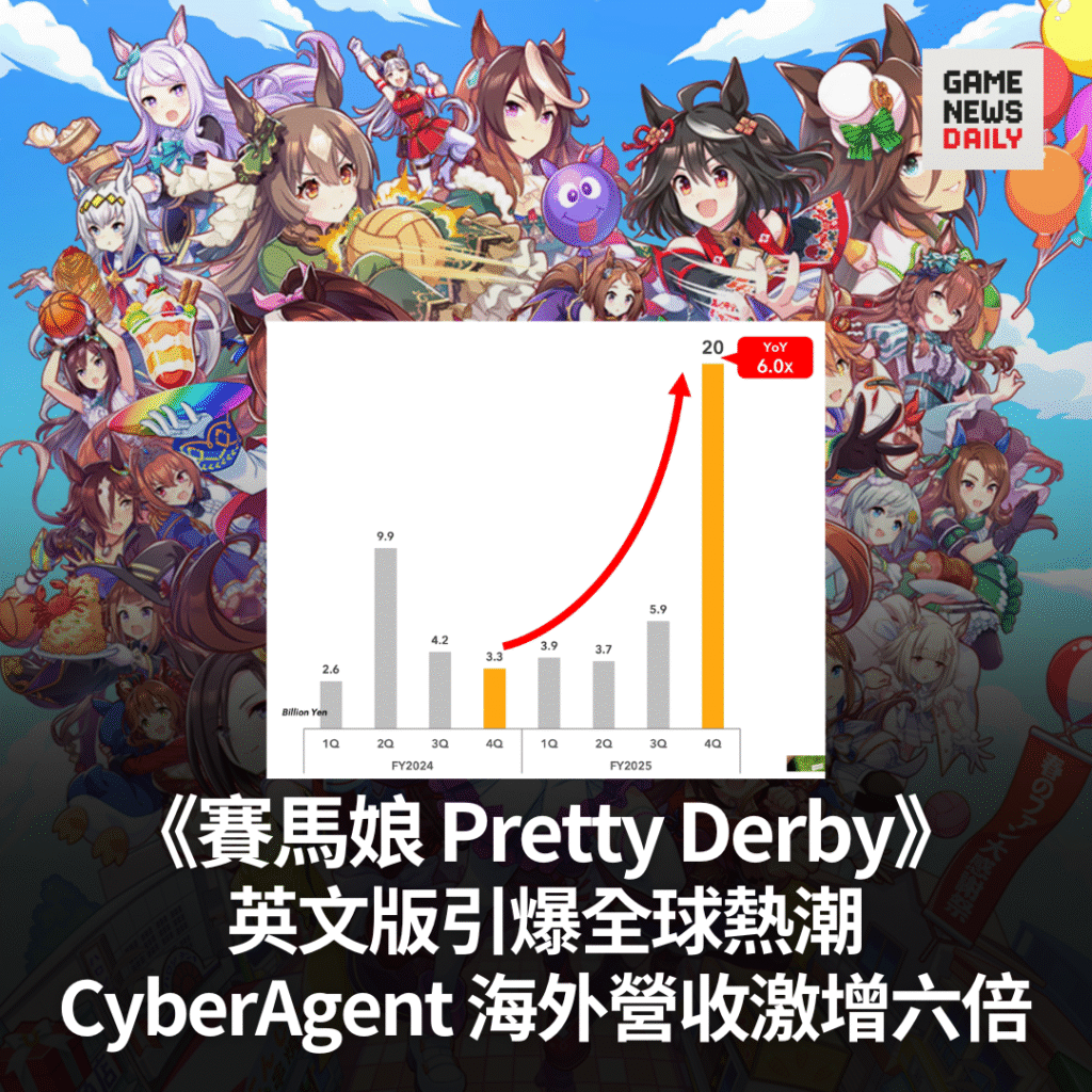 【GameNewsDaily】CyberAgent 公布截至 9 月的 2025 財政年度業績,其中海外市場表現尤為突出。公司第四季度海外營收從去年同期的 33 億日圓暴升至 200 億日圓,增幅接近六倍。此增長主要歸功於旗下 Cygames 於 6 月 26 日推出的《賽馬娘 Pretty Derby》英文國際版,在歐美市場引發熱潮。