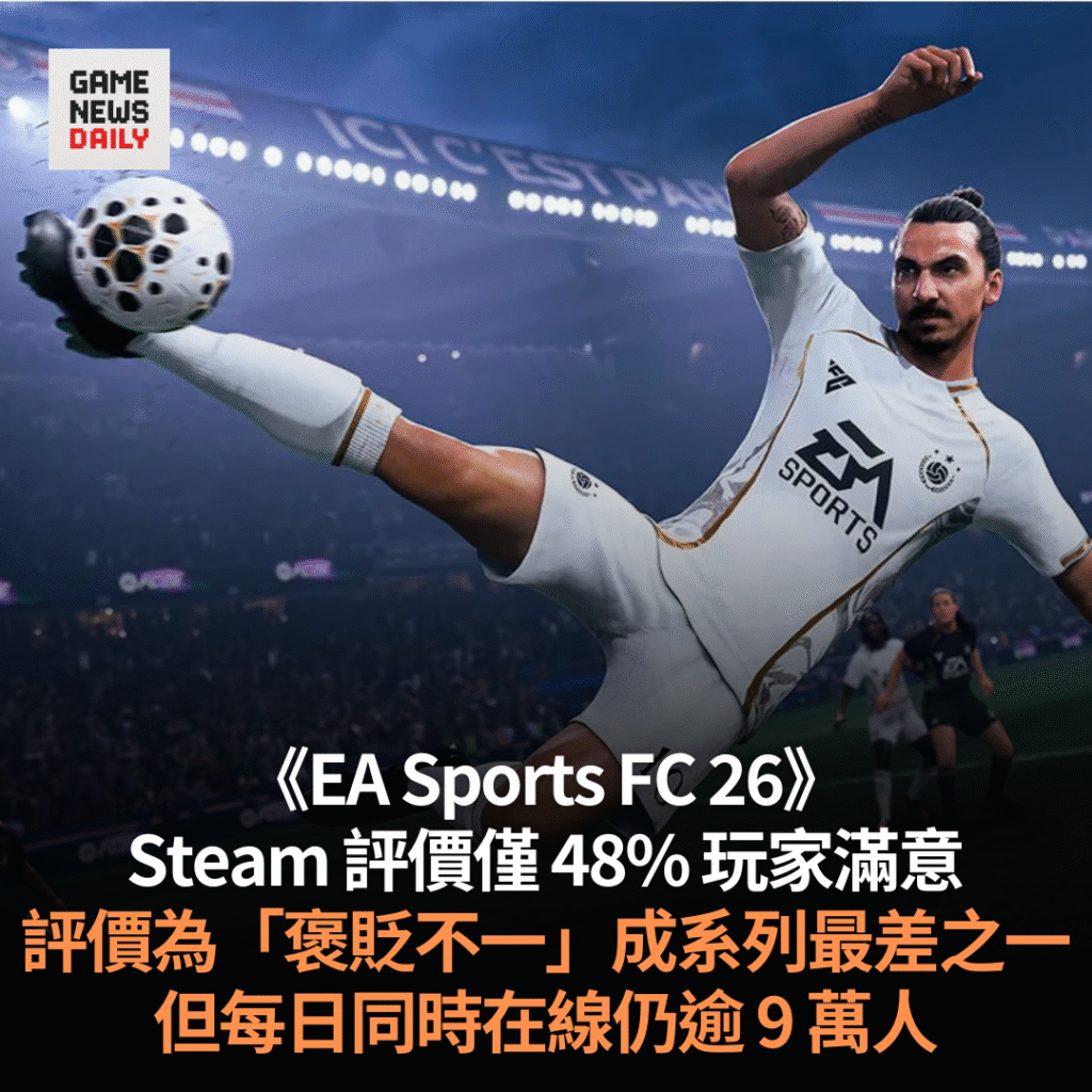 【GameNewsDaily】《EA Sports FC 26》推出後,在 Steam 平台上收獲大量負面評價,目前僅有約 48% 玩家給予好評,整體評價為「褒貶不一」,成為該系列評價最差的作品之一。