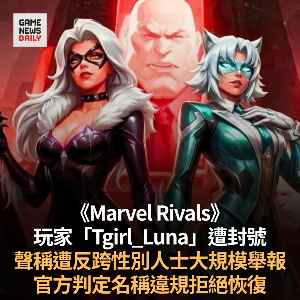 【GameNewsDaily】一名《Marvel Rivals》玩家以「Tgirl_Luna」為用戶名稱,聲稱因遭反跨性別人士大量舉報而被封鎖帳號。該玩家在提出申訴後已恢復遊戲資格,但開發團隊拒絕恢復其原有名稱,並指該名稱屬「不當內容」。