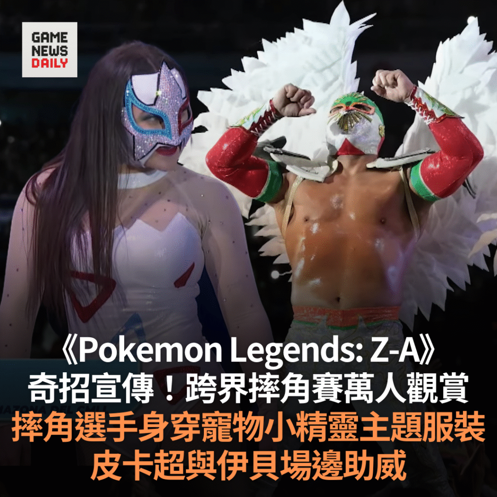 【GameNewsDaily】《Pokemon Legends: Z-A》推出前夕,官方與墨西哥摔角聯盟 CMLL 合作,近日在墨西哥城的 Arena Mexico 舉辦特別賽事,成為遊戲宣傳的一大焦點。活動中,參賽選手身穿寵物小精靈主題服裝登場,觀眾席氣氛熱烈,巨型皮卡超與伊貝在場邊為選手加油。整個兩小時比賽透過 YouTube 免費直播,現時仍可重溫完整內容。