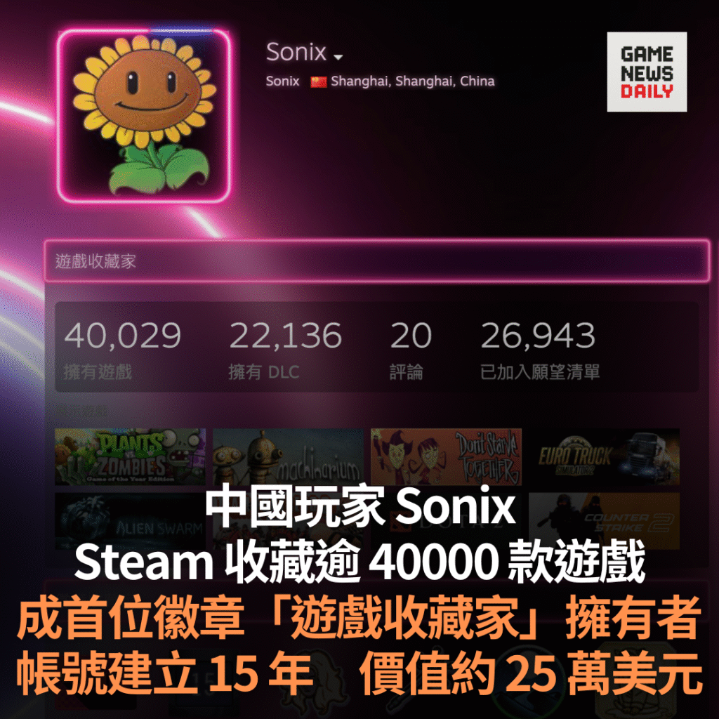 中國玩家 Sonix Steam 收藏逾 40000 款遊戲 成首位徽章「遊戲收藏家」擁有者