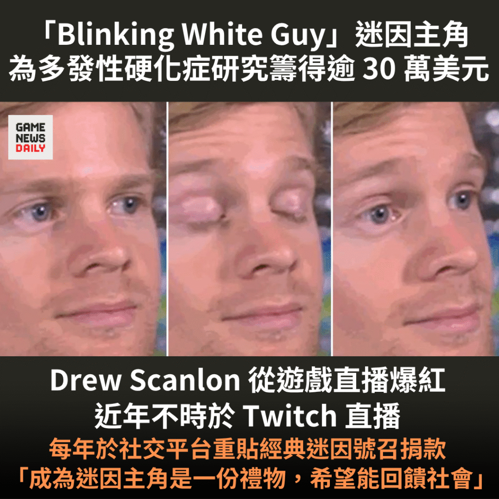 【GameNewsDaily】美國男子 Drew Scanlon 因其在 2013 年一次遊戲直播時的表情被製成「Blinking White Guy」迷因而聞名,近日他表示,已透過該迷因的網絡知名度,為多發性硬化症研究籌得超過 30 萬美元。