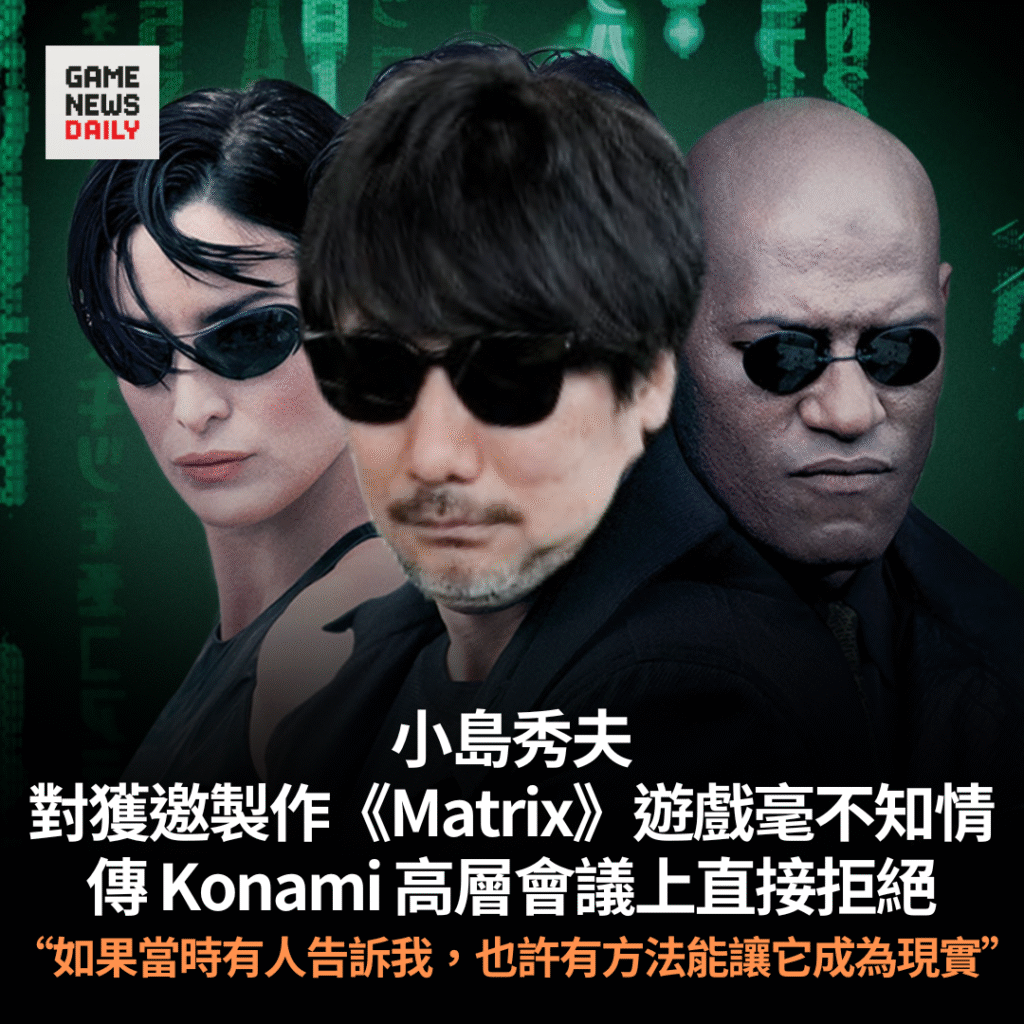 Konami 數碼娛樂前授權副總裁 Christopher Bergstresser 早前在外媒訪問中透露,《Matrix》導演華卓斯基姊妹曾於 1999 年向 Konami 提議,由小島秀夫負責製作一款根據電影改編的遊戲。不過,小島近日在社交平台 X 發文澄清,表示從未聽聞此事,並對相關傳聞感到驚訝。