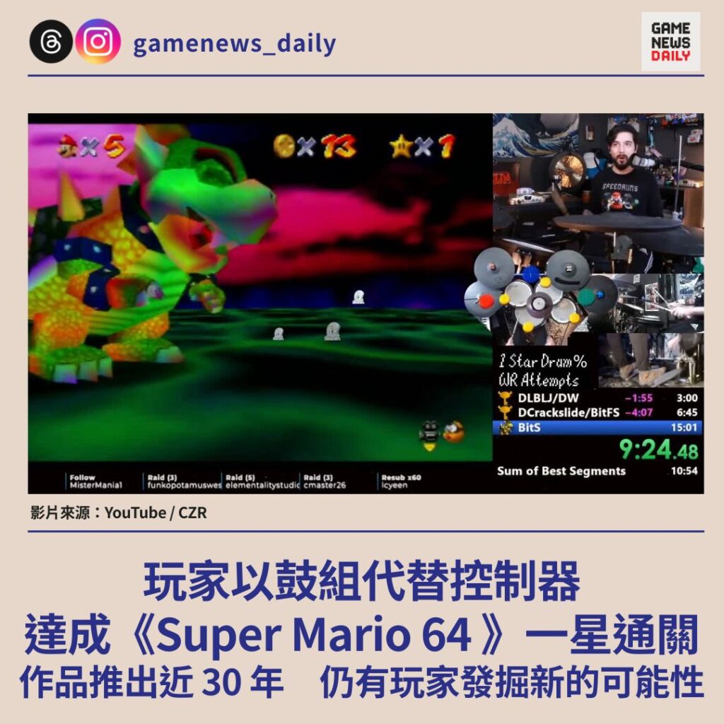 玩家以鼓組代替控制器 達成《Super Mario 64 》一星通關 僅花 10 分 27 秒 Read More »