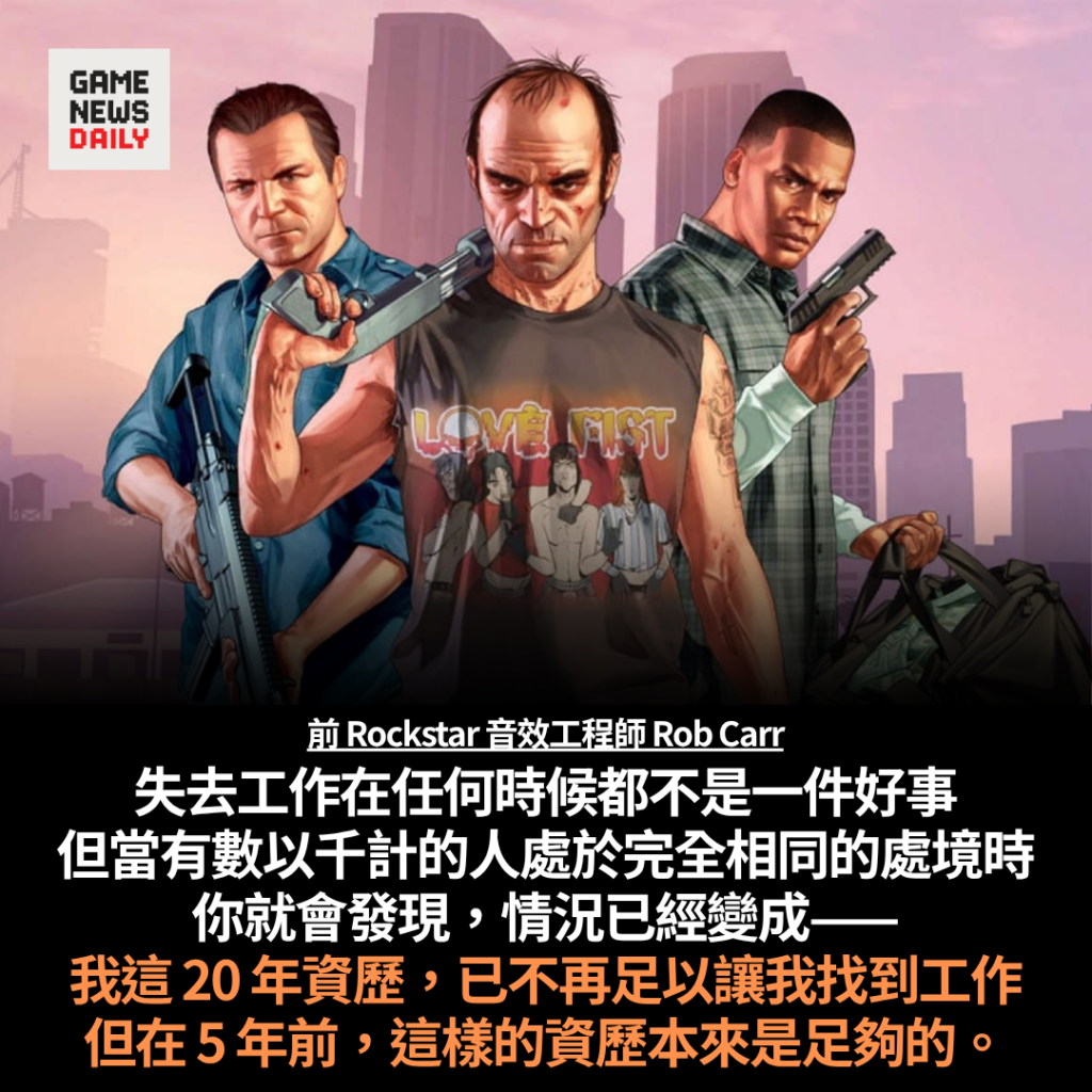 【GameNewsDaily】曾參與《GTA 5》、《黑色洛城》及《Red Dead Redemption》等作品的前 Rockstar Games 音效工程師 Rob Carr,近日談到遊戲業求職環境轉差,直言即使擁有長達 20 年資歷,如今亦未必足以協助他找到新工作。